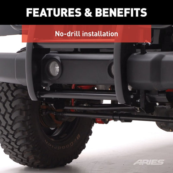 For the conqueror in every Jeep owner, the ARIES grille guard offers the tough, trail-ready look you demand. It features a strong, one-piece build and a vehicle-specific design to perfectly mount on your vehicle with no drilling required.