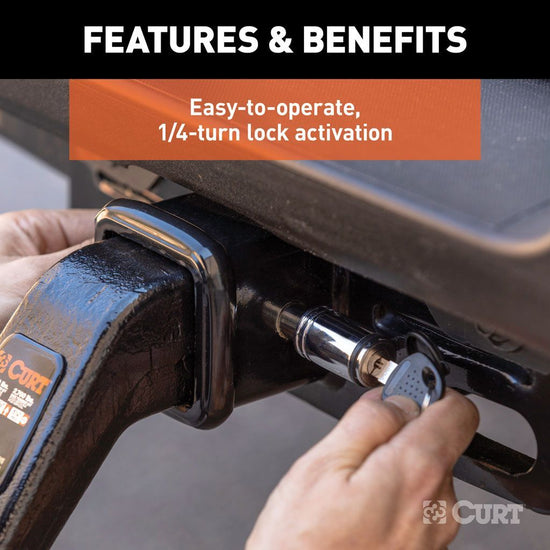 Make your tow vehicle and trailer more secure by keeping them locked up tight with a CURT hitch lock. Like a hitch pin and clip, a hitch lock is designed to insert into the fastener hole in the side of a receiver tube in order to hold a ball mount or hitch-mounted accessory in place. While a CURT hitch pin does offer sufficient strength to keep your ball mount firmly attached, a CURT hitch lock goes a step further.