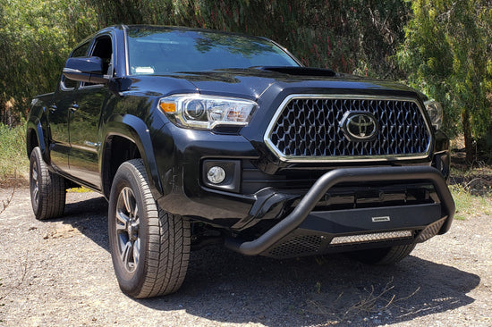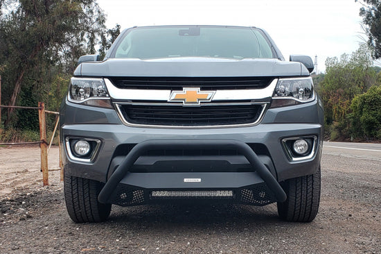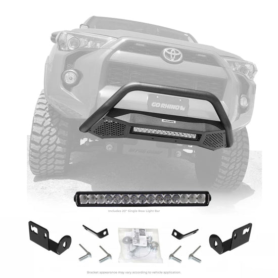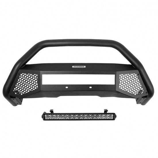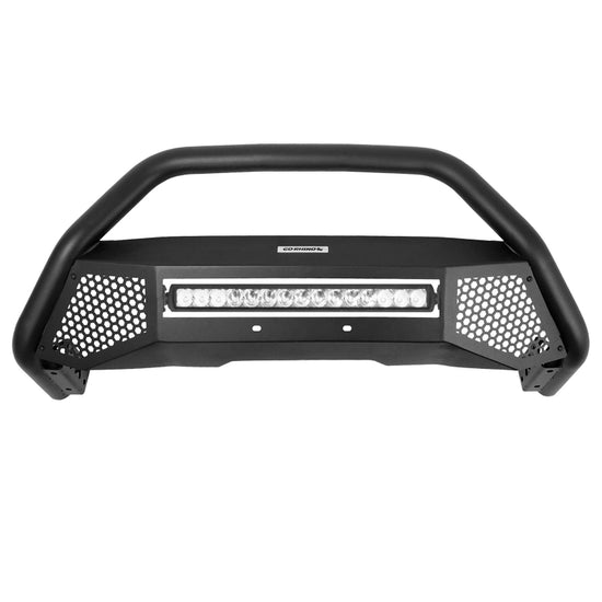 RC4 LR Bull Bar With LED light in a black textured powder coated finish. Features a tubular construction and recessed 20 Inch Single Row LED bar.