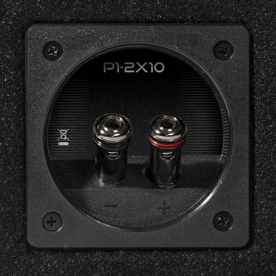 The P1-2X10 is a dual P1 10” vented enclosure with 500 Watts RMS power handling wired to a 2-Ohm load. The enclosure is constructed with 5/8” MDF, covered in high density carpet, and features quick release compression terminals.