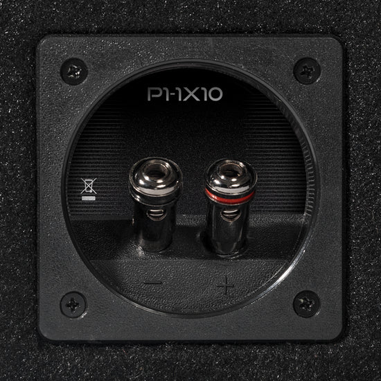 The P1-1X10 is a single P1 10” vented enclosure with 250 Watts RMS power handling wired to a 4-Ohm load. The enclosure is constructed with 5/8” MDF, covered in high density carpet, and features quick release compression terminals.