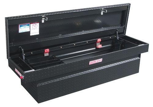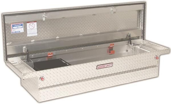 Weather Guard saddle boxes are the toughest truck boxes in the business. Our saddle box suspends from the side rails of your pickup truck, allowing for plenty of room underneath. All Weather Guard aluminum and steel crossboxes are built with the same tough features to keep your tools safe and secure. Extreme Protection lock protects against break-ins and has tamper resistant retracting lock. 90 Degree cover opening for easy access. Crimp free or drill free install mounting brackets. Body channel for extra strength. Level storage secures 48 Inch level. Full weather seal. 12 Volt access for electrical up fits. Automotive style latch with smooth one touch opening. Latch linkage protection. Reduced clearance cover
